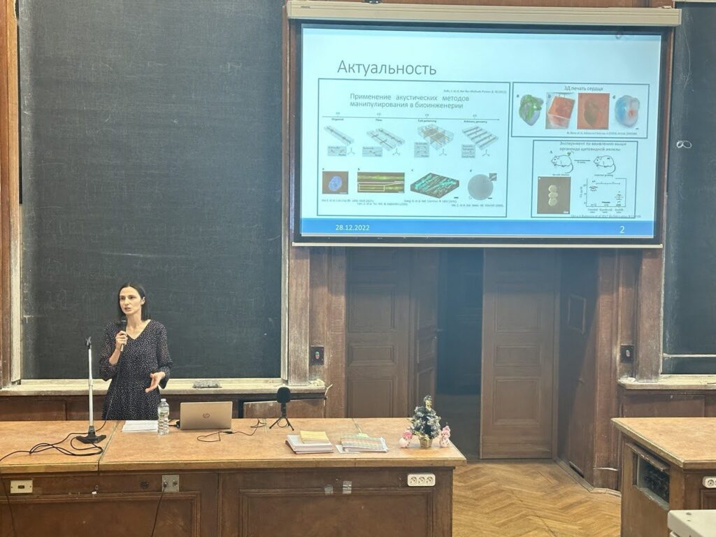 28 декабря 2022 г., в канун Нового года, состоялось заседание диссертационного совета МГУ.013.6, на котором прошла защита диссертации Алисы Крохмаль «Позиционирование объектов с помощью акустической радиационной силы в задачах биофабрикации». Работа была выполнена под руководством д.ф.-м.н. профессора Олега Анатольевича Сапожникова.