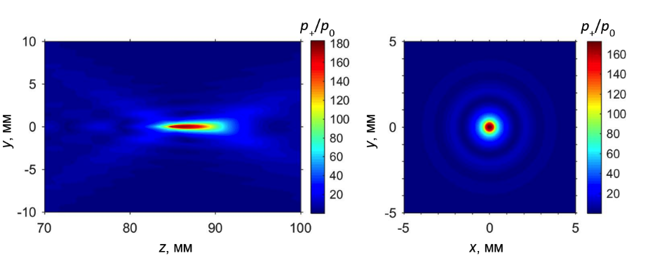 Выводятся и сохраняются двумерные распределения пиковых давлений P+ и P—, интенсивности I, тепловых источников Q, амплитуд An и фаз ϕn гармоник в плоскости оси пучка и в фокальной плоскости).