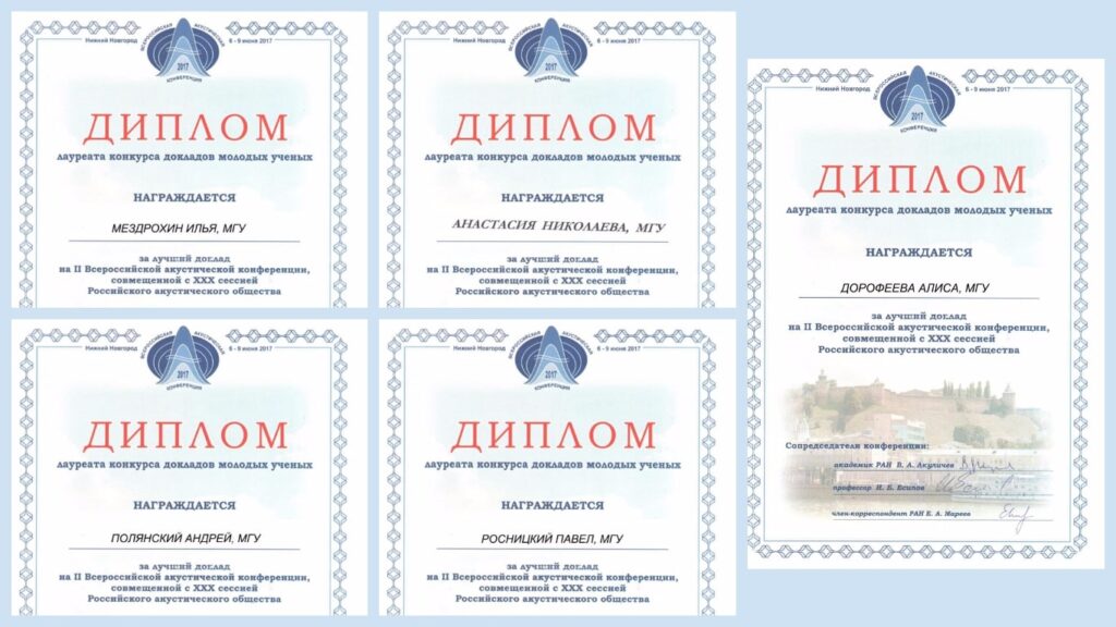 A delegation of students, PhD students and research fellows attended the conference from LIMU lab. Yuldashev P.Krit T.Nikolaeva A., and Annenkova E. made presentations in the section “Nonlinear acoustics”, M. Terzi represented the laboratory in the section “Physical acoustics”. Section “Biomedical Applications of Acoustic Methods” was represented by Cherepanova Zh.Sukhoruchkin D.Andriyahina Yu.Khasanova M.Polyansky A. and Rosnitsky P..  Dorofeeva A. and Mezrokhin I. made presentations in the section “Wave propagation and diffraction”.