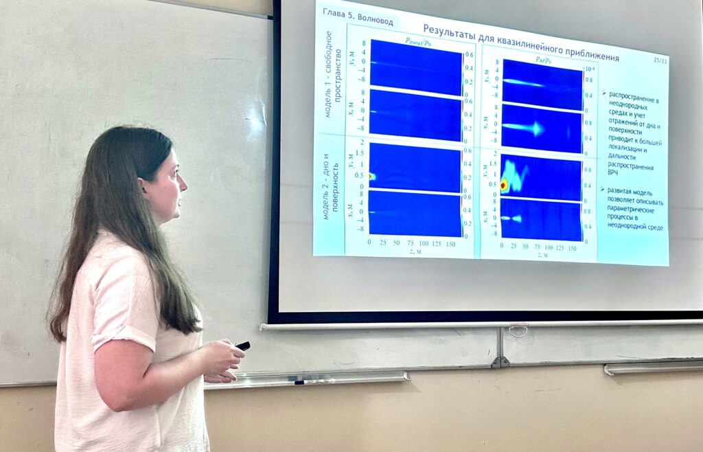 Anastasia presented her research on numerical modeling of parametric generation of a difference-frequency wave in three-dimensional ultrasound beams, supervised by Vera Khokhlova and consulted by Petr Yuldashev (reviewed by Sergey Tsysar).