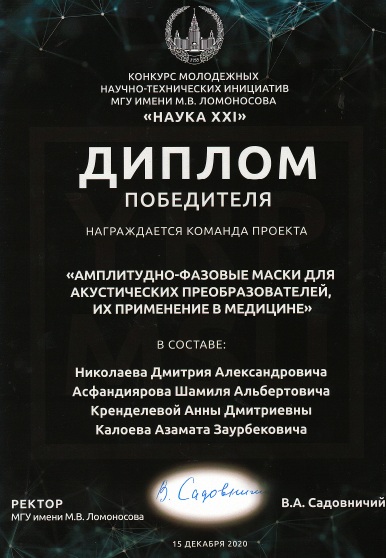 The team of students of the laboratory became the winner of the competition of scientific and technical initiatives of the Lomonosov Moscow State University «Science XXI». The project is dedicated to the development of amplitude-phase masks for single-element acoustic transducers. The team included PhD students Nikolayev Dmitry and Asfandiyarov Shamil, as well as bachelor students Kaloev Azamat and Krendeleva Anna.