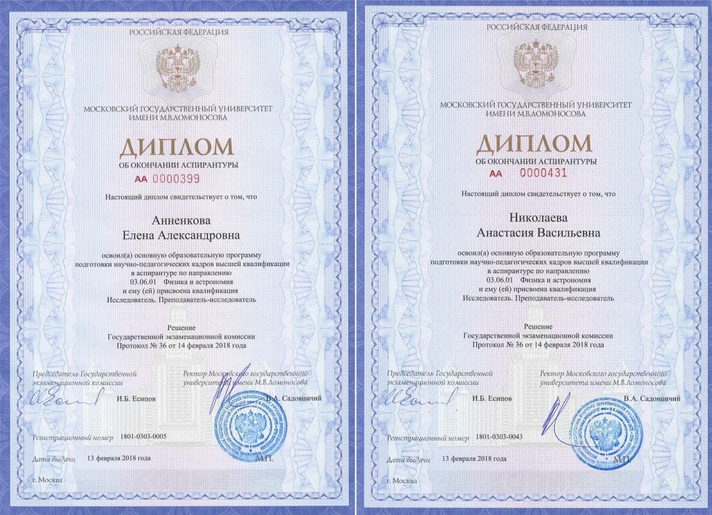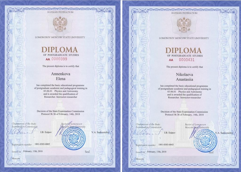 On the 6th of March 2018, a graduation ceremony of completing the new PhD Program was held at the Faculty of Physics. Since 2013, graduate education in Russia has been considered as the third level of higher education. PhD students that successfully completed such graduate programme of academic, research, and pedagogical training were awarded a qualification of “Researcher. Instructor-researcher”. Congratulations to LIMU PhD students Anastasiya Nikolaeva and Elena Annenkova with their graduation! Best wishes from Limu team to see Alyona and Nastya very soon at successful defense of their PhD theses!