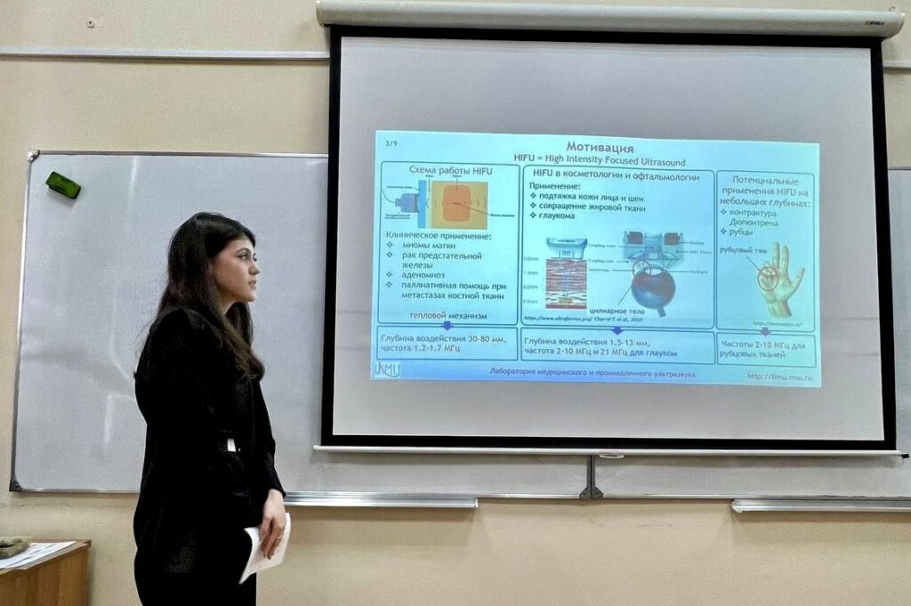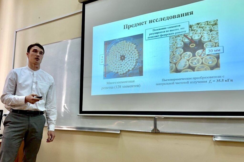 Egor Petrov gave a talk on his results on modeling the ultrasonic field of a focusing transducer in the air to determine the optimal scanning area using acoustic holography method.