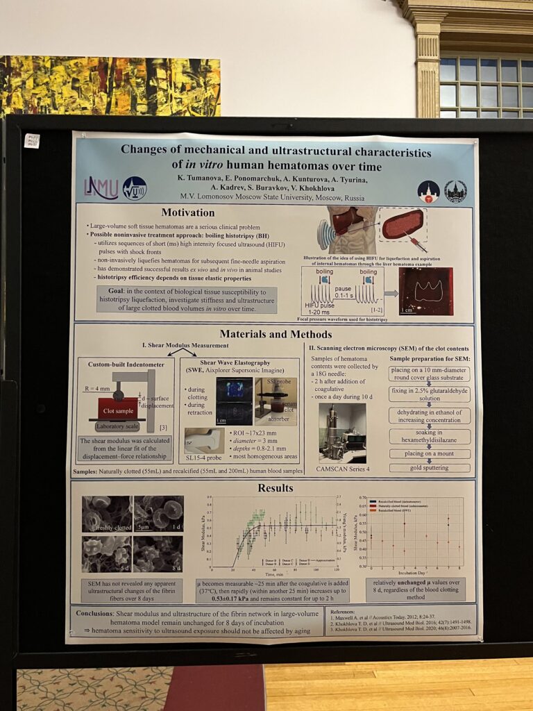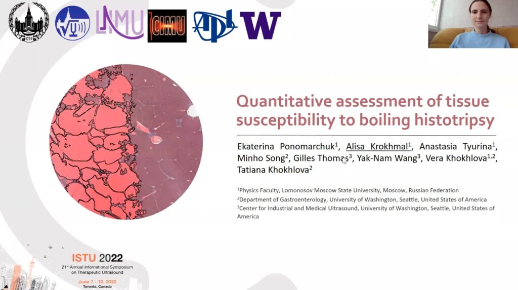 From 7th to 10th of June, the 21st Annual International Symposium on Therapeutic Ultrasound (ISTU 2022) was held in a hybrid format, in-person part taking place in Toronto, Canada. Overall, around 500 scientists and physicians from universities around the world took part in the conference, including LIMU researchers. Along with being a poster presenter, Kseniia Tumanova was an active member of the volunteer group of the Symposium. Despite the difficulties of hybrid format organization, the conference was very successful and scientifically rich covering diverse aspects of latest achievements in the field of therapeutic ultrasound. In the in-person poster session, Kseniia Tumanova presented the results of her research on changes of mechanical and ultrastructural characteristics of in vitro human hematomas over time. In the online session, Azamat Kaloev has successfully presented his poster “Single acoustic hologram for reconstructing acoustic fields of HIFU arrays”, Pavel Rosnitskiy presented his research “Numerical approach for treatment planning and aberration correction for renal HIFU ablation based on computed tomography data”, and Alisa Krokhmal presented her work “Quantitative assessment of tissue susceptibility to boiling histotripsy”.