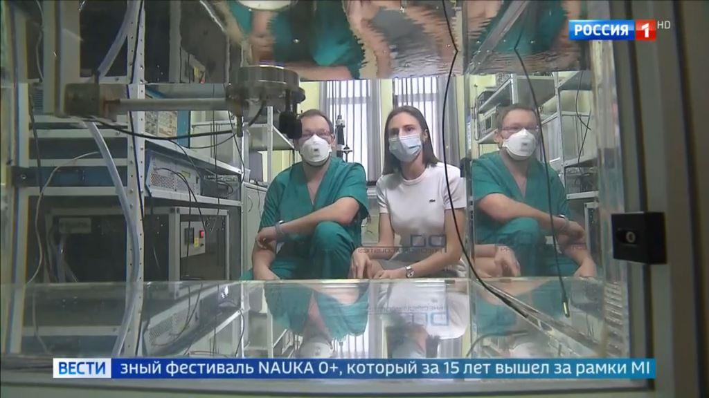 Within the framework of the Science Festival, members of LIMU A.A. Krokhmal and S.A. Tsysar took part in filming a plot for the news release of the Russia-1 channel. The film crew visited the LIMU experimental laboratory in the Lomonosov building, and “Vesti” correspondent G. Baltaeva asked about the trends in the study of ultrasound and its application in biofabrication problems.