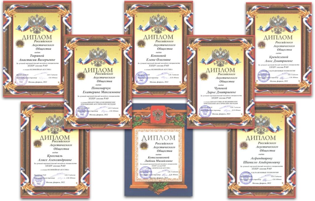Overall, 17 reports were presented by LIMU MS students E.O. Konnova, L.M. Kotelnikova, D.D. Chupova, P.A. Pestova and A.D. Krendeleva, postgraduates D.A. Nikolaev, S.A. Petrosyan, A.A. Krokhmal, E.M. Ponomarchuk, S.A. Asfandiyarov and A.V. Tyurina, as well as LIMU research fellows O.A. Sapozhnikov, V.A. Khokhlova, S.A. Tsysar, P.V. Yuldashev, M.M. Karzova and P.B. Rosnitskiy. Most of our students and postgraduates were awarded diplomas of the Russian Acoustical Society for the best scientific reports of young specialists.