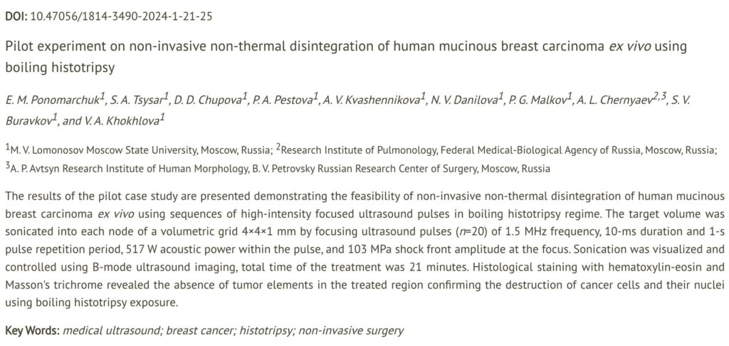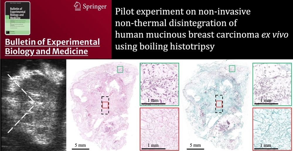 We usually only post news about our articles published in Q1 journals, however we believe our recent paper “Pilot experiment on non-invasive non-thermal disintegration of human mucinous breast carcinoma ex vivo using boiling histotripsy” published in the «Bulletin of Experimental Biology and Medicine» deserves special attention.