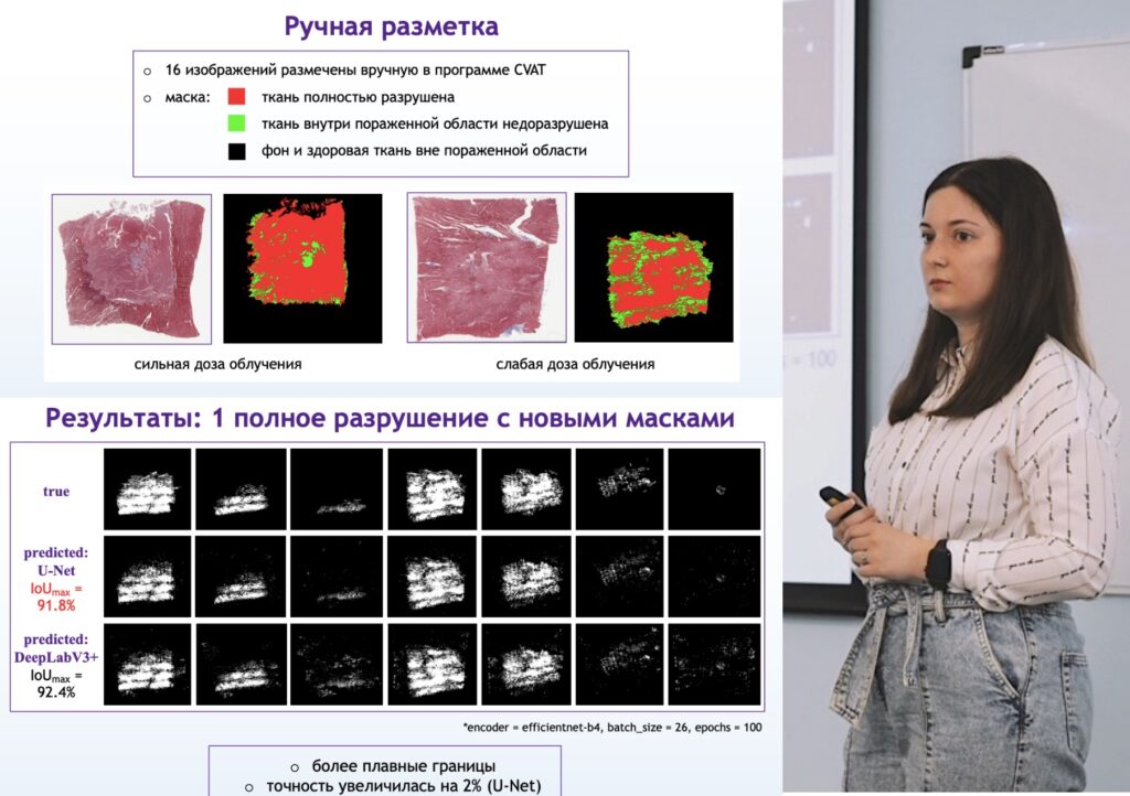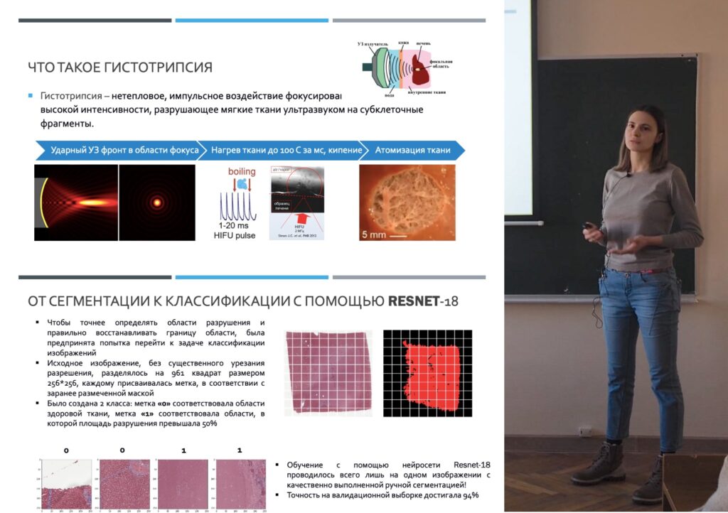 The project of Krokhmal Alisa “Segmentation of tissue histology with traces of destruction as a result of histotripsy” and the one of Tyurina Anastasia “Segmentation of histological heart images using neural networks” are aimed at using neural networks in the problems of identifying the affected areas of various biological tissues and assessing the total volume of these lesions obtained as a result of noninvasive exposure to tissue by high-intensity pulsed focused ultrasound.