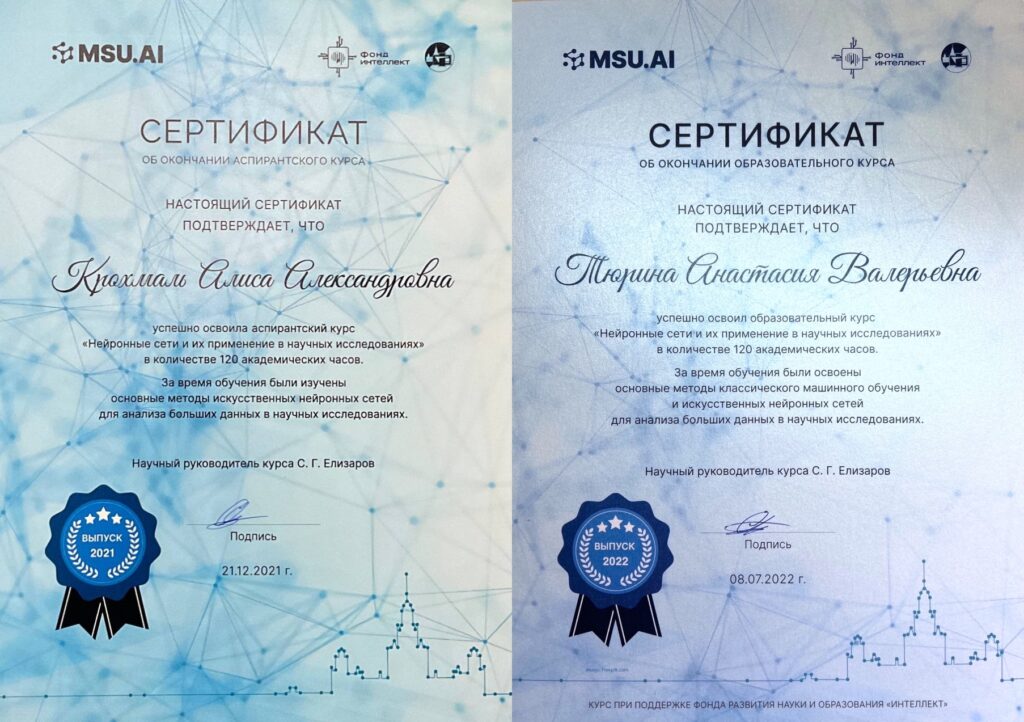 LIMU PhD students Krokhmal Alisa and Tyurina Anastasia have passed the course on the use of neural networks in scientific research, sponsored by the Intellect Foundation on the basis of the Physics Faculty, MSU.