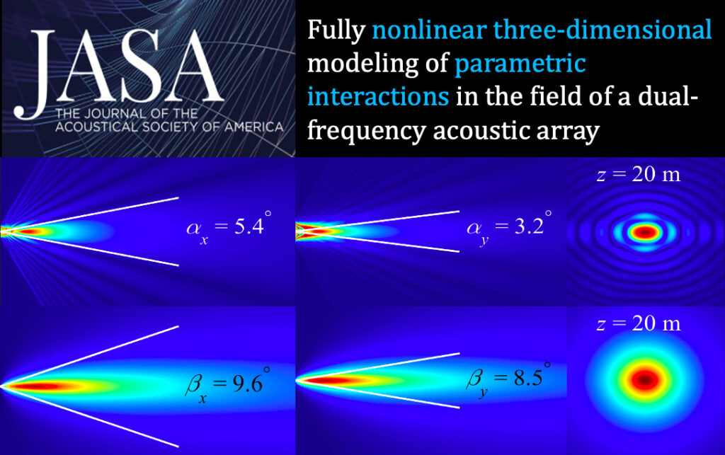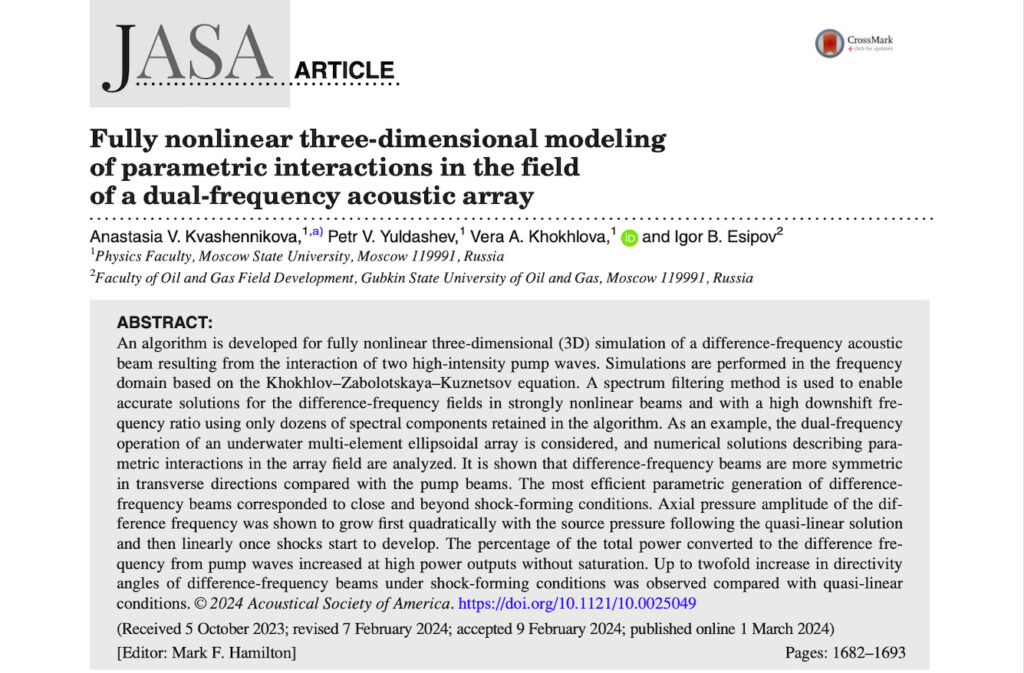 A top-rated journal The Journal of the Acoustical Society of America (Q1, IF 2.1) has published our article “Fully nonlinear three-dimensional modeling of parametric interactions in the field of a dual-frequency acoustic array” based on the results of our joint research with Gubkin Russian State University of Oil and Gas.