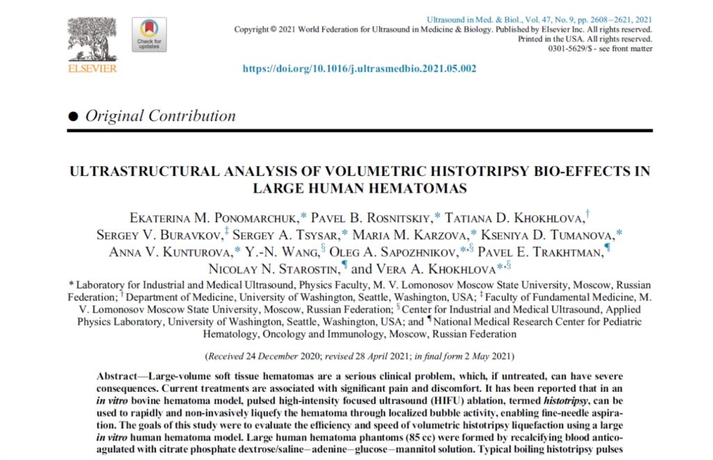 A paper titled «Ultrastructural analysis of volumetric histotripsy bio-effects in large human hematomas» was published in a top-rated Ultrasound in Medicine and Biology journal (Q1, IF 2.998) co-authored by LIMU research fellows, graduate and undergraduate students, and alumni E.M. Ponomarchuk, P.B. Rosnitskiy, S.V. Buravkov, S.A. Tsysar, M.M. Karzova, K.D. Tumanova, A.V. Kunturova, O.A. Sapozhnikov, and V.A. Khokhlova.