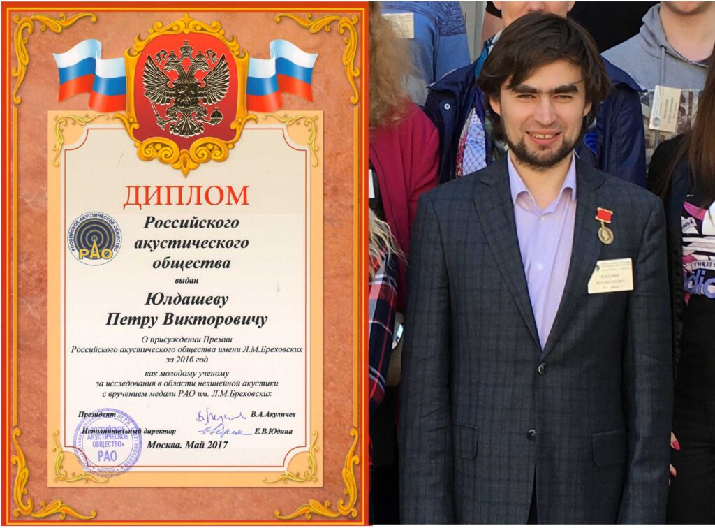 Petr Yuldashev was promoted to the position of Senior Lecture of the Physics Faculty of MSU and received an award from Russian Acoustical Society named after L.M. Brekhovskikh.
