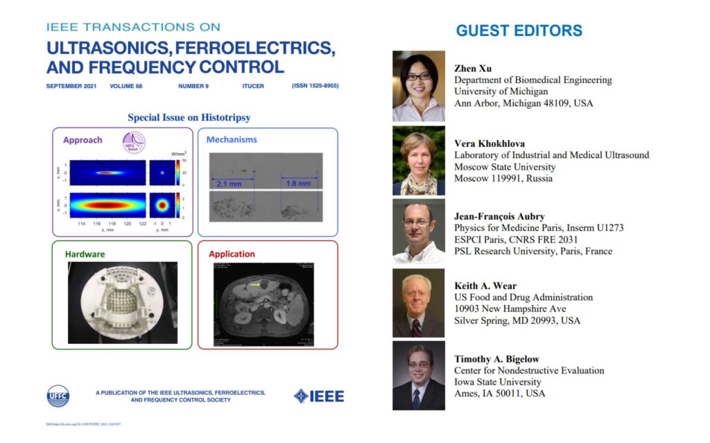In September 2021, a special issue on histotripsy of the IEEE Transactions on Ultrasonics, Ferroelectrics, and Frequency Control was published. Histotripsy is a new therapeutic technology to liquefy tissue into acellular debris using sequences of high-power focused ultrasound pulses. The research on histotripsy has been rapidly growing in the past decade and this special issue reflects most recent achievements in the methods, mechanisms, hardware, and applications of histotripsy. One of the organizers and editors of the issue was V.A. Khokhlova. Four articles of the issue were co-authored with members of the LIMU team: V.A. Khokhlova, O.A. Sapozhnikov, P.V. Yuldashev, M.M. Karzova, P.B. Rosnitsky, F.A. Nartov.