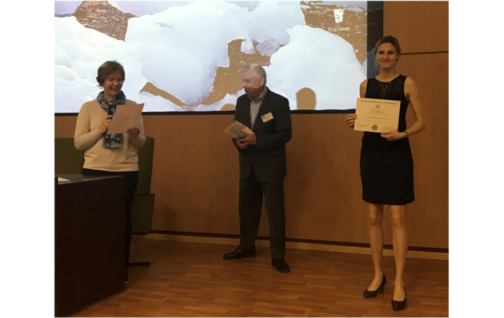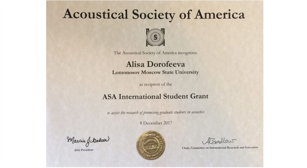 LIMU PhD student Alisa Dorofeefa received a Student Award of 2018 from the Acoustical Society of America to assist the research of promising graduate students in acoustics. Award Certificates were presented to the awardees on 29th of May 2018 in the conference hall of the P.P. Shirshov Institute of Oceanology at the opening ceremony of the XVI School-Seminar named after academician L.M. Brekhovskih “Acoustics of the Ocean” combined with the XXXI session of the Russian Acoustic Society.
