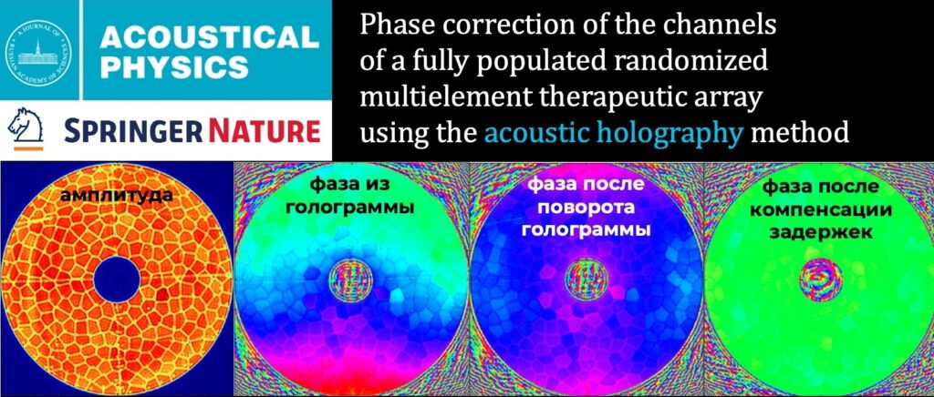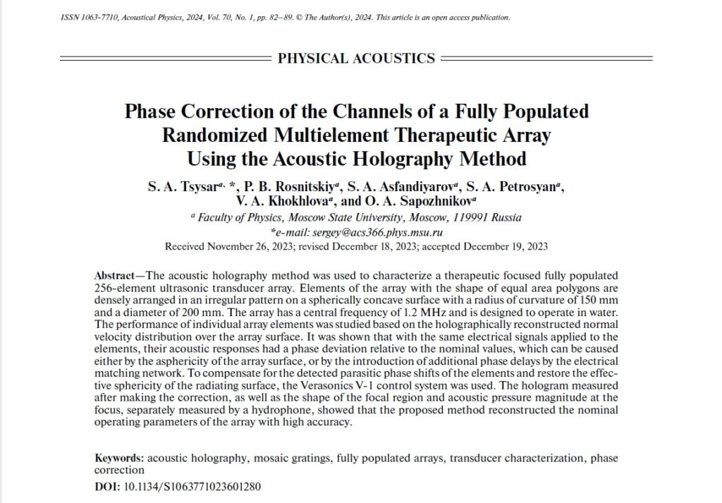 We usually only post news about our papers published in Q1 journals, but recently LIMU staff and PhD students S.A. Tsysar, P.B. Rosnitsky, S.A. Asfandiyarov, S.A. PetrosyanV.A. Khokhlova and O.A. Sapozhnikov presented the first use of the acoustic holography method for phase correction of a unique multi-element HIFU array with a mosaic arrangement of elements in the Acoustical Physics publication.