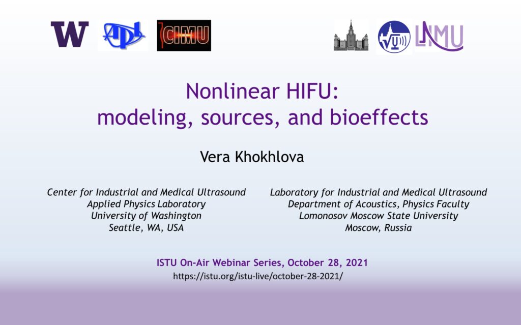 V.A. Khokhlova presented a lecture on “Nonlinear HIFU: Modeling, Sources, and Bioeffects” at October 28, 2021 On-Air webinar series of the International Society for Therapeutic Ultrasound (ISTU).