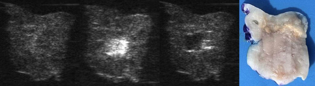 • паровые пузырьки, генерируемые в процессе гистотрипсии, сильно отражают ультразвук и предстают гиперэхогенными (яркими) на УЗИ;