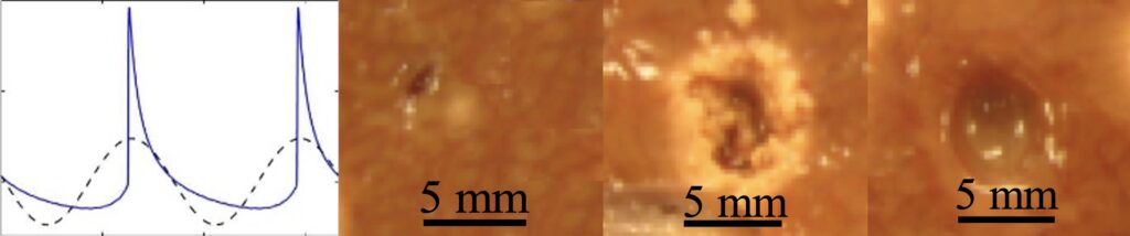 • исследуются физические механизмы воздействия на ткань, кавитационные эффекты в ткани при ее облучении ультразвуком с ударными фронтами;