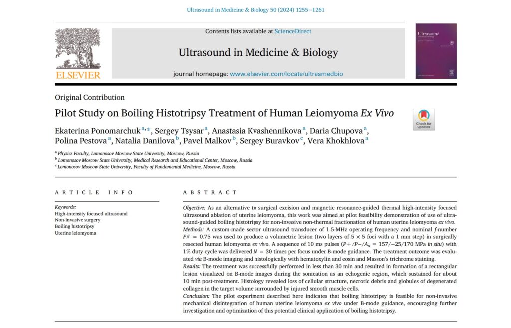 В высокорейтинговом журнале Ultrasound in Medicine and Biology (Q1, IF 2.9) опубликована статья «Pilot study on boiling histotripsy treatment of human leiomyoma ex vivo» по результатам наших совместных исследований с МНОЦ МГУ.