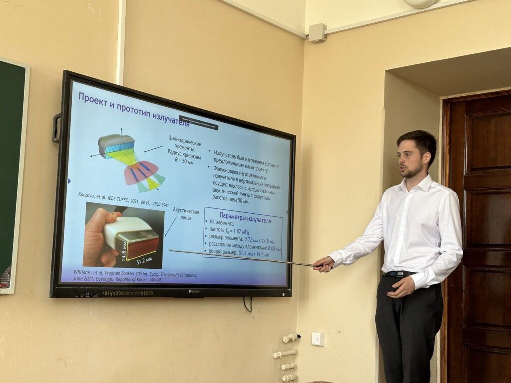 - Солонцова Олега «Сравнение лучевого и дифракционного методов коррекции аберраций при фокусировке ультразвука через кости черепа» (научный руководитель Хохлова Вера Александровна, рецензент Крохмаль Алиса Александровна).