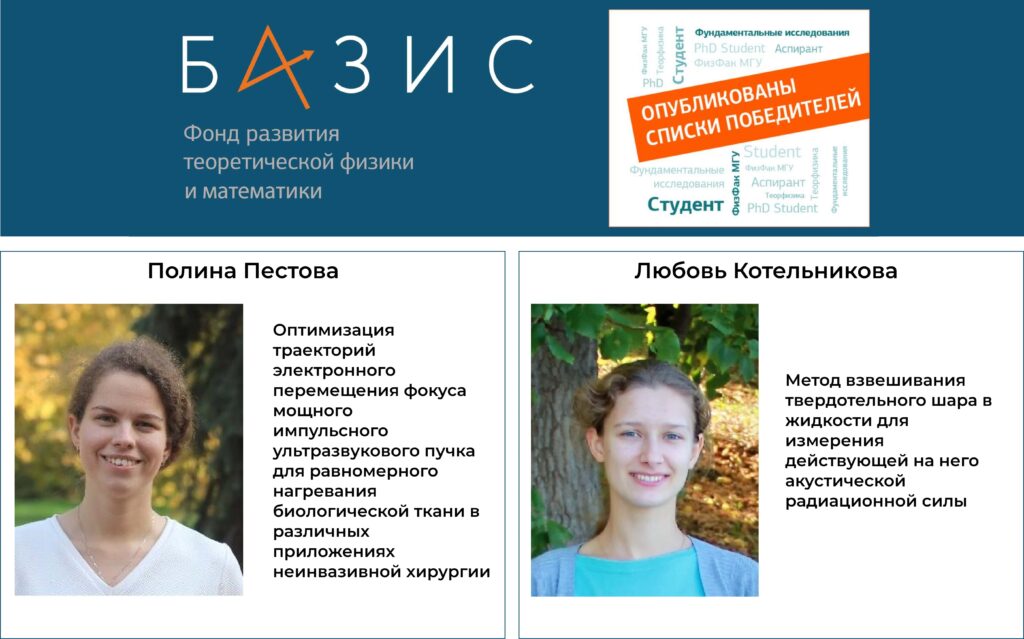Фонд развития теоретической физики и математики «БАЗИС» поддерживает студентов в их стремлении вести научную деятельность на физическом факультете МГУ. Этой зимой победителями стипендиального конкурса стали наши студентки Полина Пестова и Любовь Котельникова.
