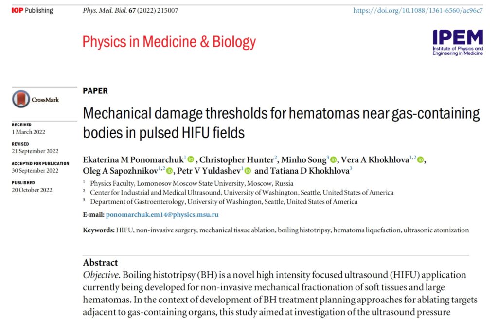 Результаты экспериментов по разжижению гематом методом гистотрипсии с кипением вблизи воздухсодержащих органов опубликованы в журнале Physics in Medicine and Biology (Q1)
