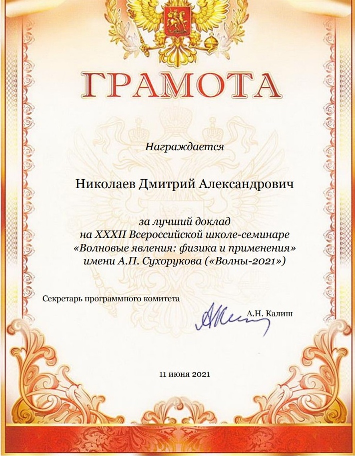 По результатам голосования участников школы аспирант Д.А. Николаев был награжден грамотой за лучший доклад в секции «Акустика неоднородных сред».