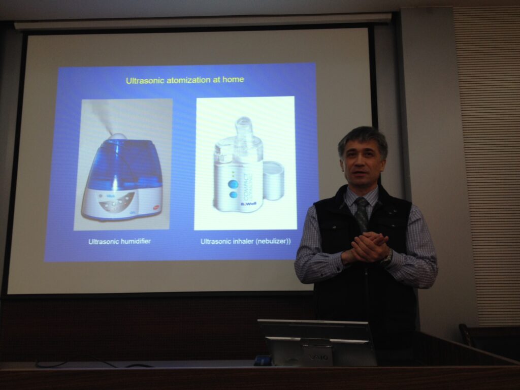 В.А. Хохлова выступила с лекцией «Методы характеризации медицинских ультразвуковых полей, основанные на моделировании нелинейных уравнений с экспериментально полученными граничными условиями». Темой лекции О.А. Сапожникова была «Акустические фонтаны, ультразвуковая атомизация и их возможная роль в разрушении биоткани мощным фокусированным ультразвуком». Призыв к студентам на входе в университет: будьте честными,будьте сильными, хорошо учитесь и много работайте.